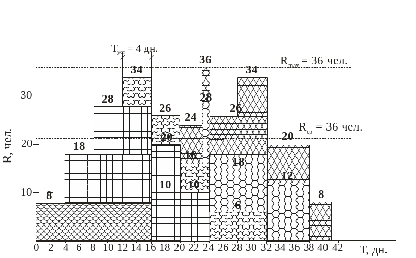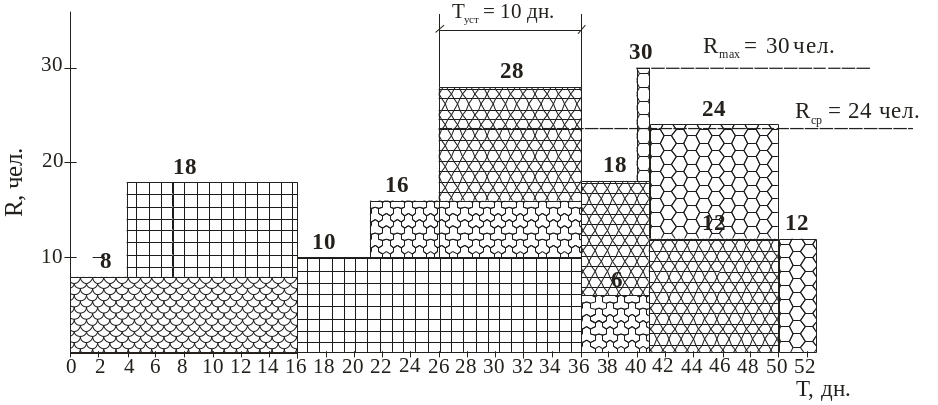 График потока рабочих (рисунки 4, 6) строится аналогично примеру 1 с указанием максимального Rmax и среднего Rср количества рабочих, установившимся периодом Туст., и оценивается равномерность распределения рабочих ресурсов по двум показателям К1 и К2.