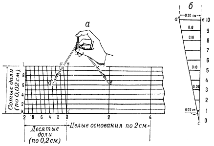 При достаточной остроте зрения или с помощью увеличительного стекла отсчёт с точностью 0,1 мм может быть произведён по шкале с миллиметровыми делениями (рис.1а). Деления шкалы «прорезаны» в металле и поэтому одна игла циркуля-измерителя может быть точно зафиксирована на отсчёте «0». По положению второй иглы оцениваются целые и десятые доли миллиметра.