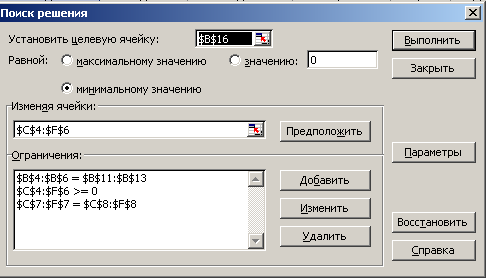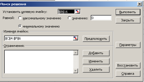 Если сейчас запустить процесс подбора параметров, то будет найден вариант, где все переменные равны нулю. И это правильно если не перевозить ничего, то это самый дешевый вариант.