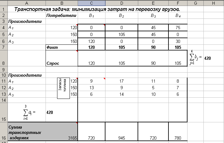 Минимальная сумма затрат на перевозки при соблюдении всех условий равна 3165 усл. ден. ед.