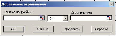 Следует ввести левую часть ограничения в левое поле, выбрать знак условия, накладываемого на значение и ввести правую часть ограничения; нажать кнопку Добавить(Add).