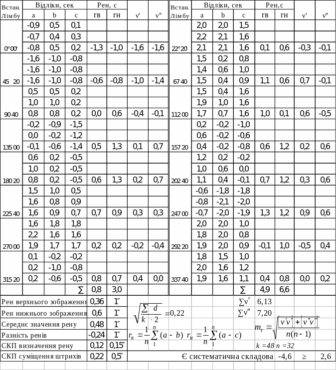 У таблиці 8 на установці лімба 0о00 обчислений за середніми значеннями відліків рен верхнього зображення штрихів лімба дорівнює rв=-1,3”, рен нижнього - , rн=-1,0”