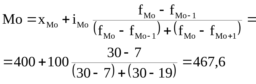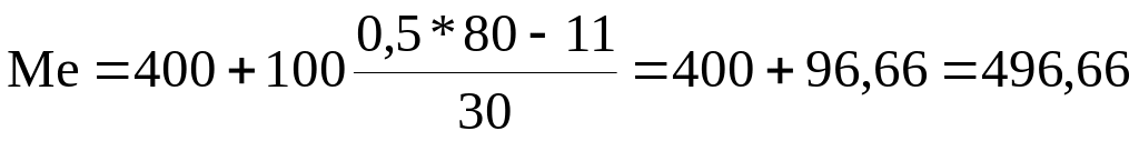 Определим прежде всего медианный интервал. В данной задаче сумма накопленных частот, превышающая половину всех значений (41), соответствует интервалу 400 - 500. Это и есть медианный интервал, в котором находится медиана. Определим ее значение по приведенной выше формуле.