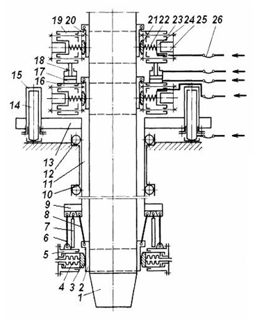 Механізм перепуску електрода складається із двох затискних кілець 16 і 19(див.рис. 1.2), одне й з яких закріплено на траверсі 13(див.рис. 1.2) несучого циліндра, а інше опирається на штоки 18(див.рис. 1.2) гідроциліндрів 17(див.рис. 1.2) , закріплених на нижнім кільці. Кожне затискне кільце містить по шести однакових гідравлічних-пружинно-гідравлічних затискачів. У затискних пристроях круглих електродів затискачі розташовані рівномірно по окружності, плоских електродів - по трьох з кожної плоскої грані електрода.