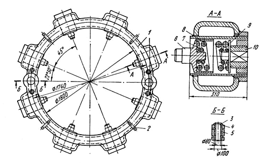На феросплавних печах ранніх конструкцій застосовують кільцеві пружинні затискачі, що складаються з кільця, пружинного затискача й контактних щік. Кільце складається із двох півкілець , з'єднаних сталевими пальцями 3(див. рис. 1.3) з надягнутими на них бронзовими втулками 4 і 5(див.рис. 1.3) .