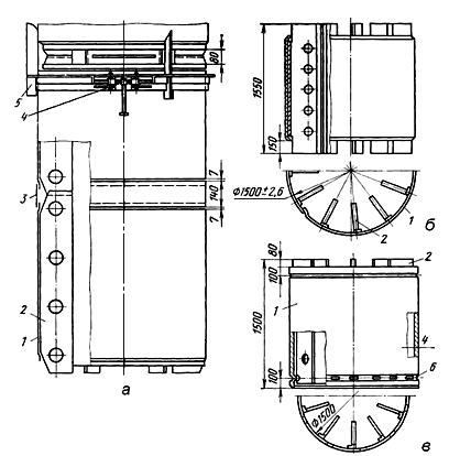 Циліндричну частину секції виготовляють із одного листа товщиною 4 мм. Тут ребра жорсткості 2 виготовляють окремо. У кожному ребрі проробляють по п'ятьох круглих отворів діаметром 70 мм. Зборка циліндрів і установка ребер, а також приварку ребер здійснюється на спеціальних складальних стендах-кондукторах.