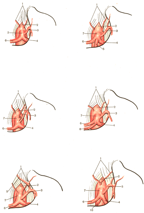 1 — аа. phrenicae inferiores; 2 — aorta abdominalis; 3 — a. gastrica sinistra; 4 — a. lienalis; 5 — a. mesenterica superior; 6 — a. hepatica cornmunis; 7—truncus coeliacus; 8 — a. hepatica accessoria dextra; 9 — a. hepatica accessoria sinistra; 10 — a. pancreaticoduodenalis inferior.