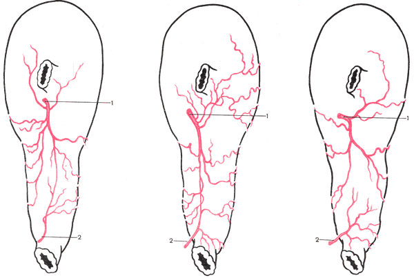 Располагаясь на малой кривизне, левая желудочная артерия отдает ветви к кардиальной части желудка, затем делится на два ствола (передний и задний). От этих стволов отходит по 4—5 ветвей к соответствующим стенкам желудка. Анастомоз левой желудочной артерии с правой желудочной в большинстве случаев осуществляется посредством заднего ствола, в более редких случаях — посредством обоих стволов или переднего ствола. Иногда левая и правая желудочные артерии не анастомозируют между собой. На рис. 160 представлены варианты ветвления желудочных артерий на малой кривизне.