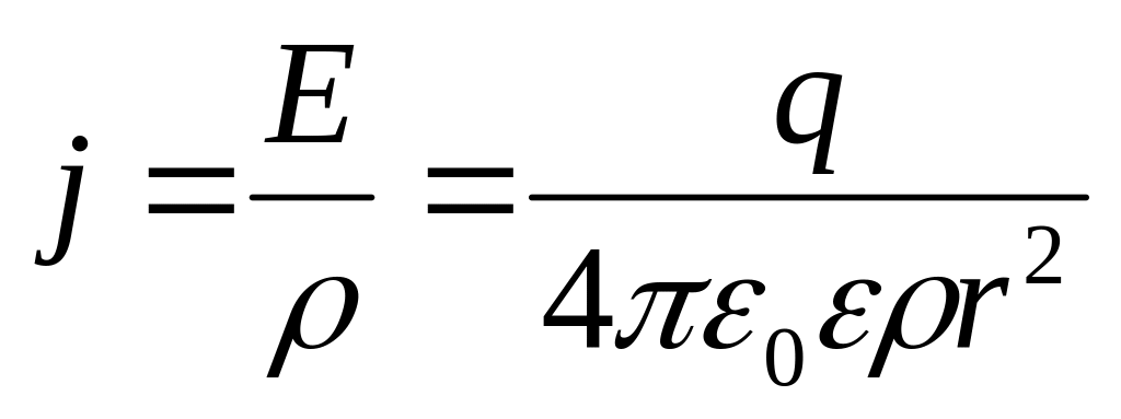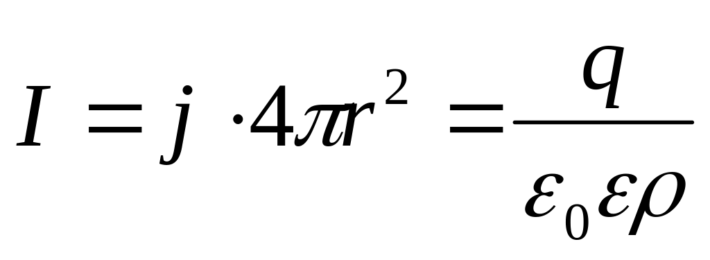 2 способ. При стационарном токе нескомпенсированные заряды находятся только на электродах, играющих в данном примере роль поверхностей однородной проводящей среды. В самой среде объемная плотность заряда равна нулю. Пусть заряд внутреннего электрода равен q. Тогда электрическое поле в среде