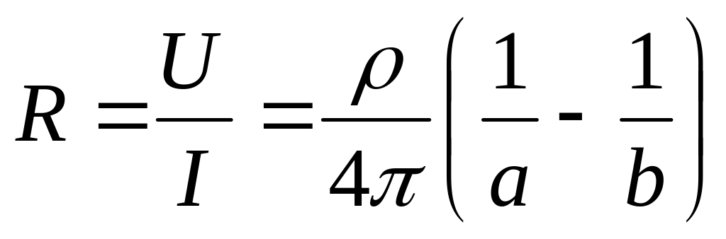 Пример. Ток течет между двумя концентрическими сферическими электродами, радиусы которых a и b, по однородой проводящей среде, подчиняющейся закону Ома. Удельное сопротивление среды . Это может быть электролит.