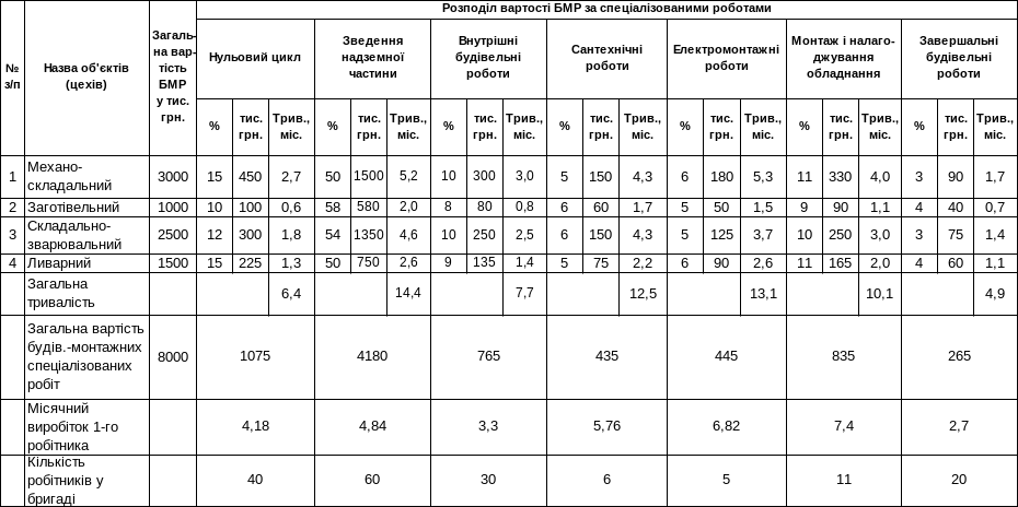 Для встановлення обсягів будівельних і спеціалізованих потоків у тисячах гривень по кожному об’єкту беремо їх відсотки від загальної вартості БМР, вказані у таблиці 1.4 для відповідних об’єктів, заносимо їх у таблицю 1.7 та виконуємо обчислення обсягів робіт.