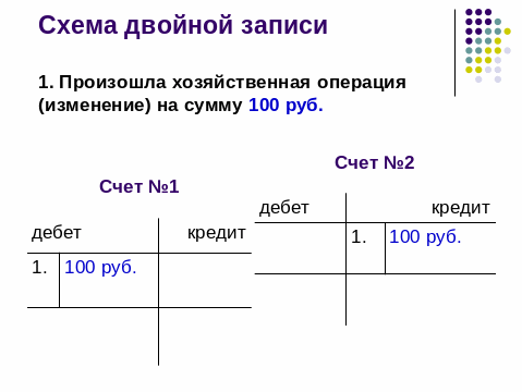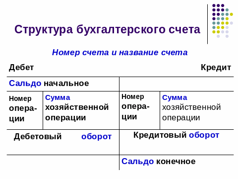 Любой счёт делится на две части - левая сторона (колонка) счёта называется Дебет, правая – Кредит. На счетах отражается информация о суммах совершенных хозяйственных операциях.
