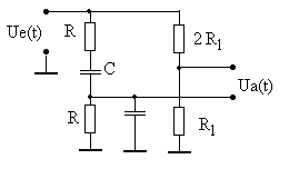 Двойной Т- образный фильтр обладает частотной характеристикой, идентичной частотной характеристике фильтра Вина- Робинсона. Он тоже пригоден для подавления сигналов в определенной частотной области. В отличие от моста Вина- Робинсона выходное напряжение снимается относительно общей точки. Для высоких и для низких частот Ua=Ue.
