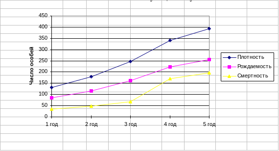 1. Введите значения исходных данных (Плотность популяции=130 и Плодовитость=1,3) и постройте в одной системе координат графики изменения плотности, рождаемости и смертности популяции голубя за 5 лет.