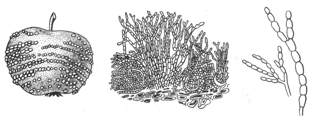 1. Рассмотреть пораженное яблоко. Отметить подушечки с конидиями (конидиальное спороношение типа Monilia).