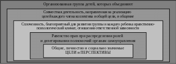 В представленной выше схеме отражены те признаки детского (ученического) коллектива, которые признаются большинством исследователей, и предлагаются в различной текстовой интерпретации практически во всех учебных пособиях по педагогике.