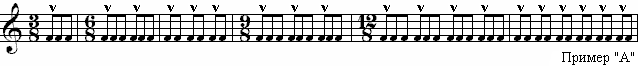 Прежде, чем приступить к основной части этой темы, познакомимся, для начала (на примере шести следующих тактов (пример под буквой «А») с упрощённым её понятием (галочки, поставленные над некоторыми нотами, показывают расстановку акцентов).