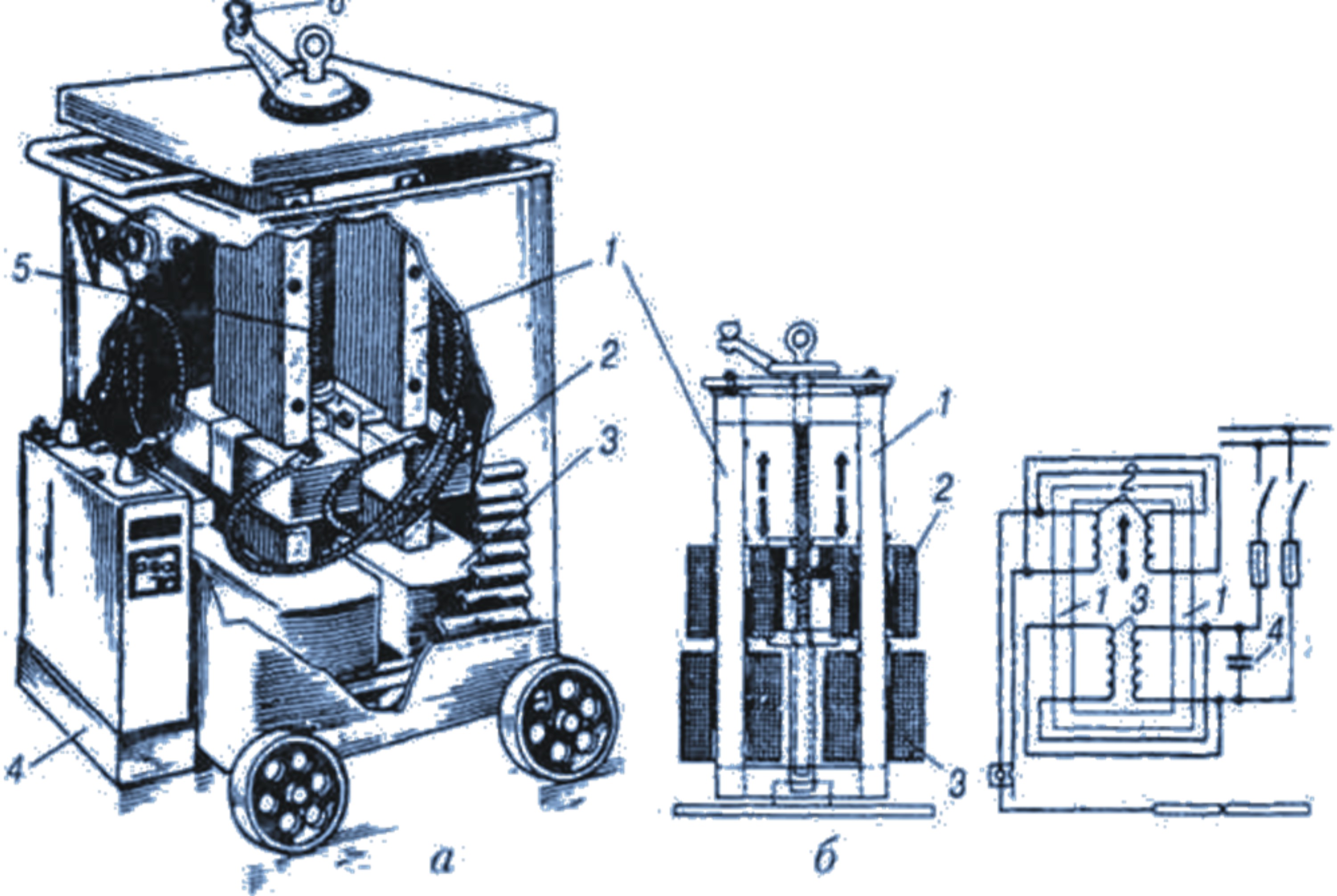 Принцип дії трансформатора ґрунтується на явищі електромагнітної індукції. Він складається з корпусу, в середині якого розміщений магнітопровід 1 (осердя), зібраний з тонких (0,5 мм) лакованих пластин електротехнічної сталі (рис. 5.2) і на якому розміщені первинна 3 та вторинна 2 обмотки. Для підвищення коефіцієнта трансформації в трансформаторах ТСК використовують батарею конденсаторів 4, яку вмикають паралельно до первинної обмотки.