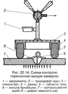 Для випробування на щільність ділянку зварного шва покривають сумішшю, яка утворює піну, потім накладають вакуумну камеру, яку притискають до поверхні виробу і включають вакуумний насос. При цьому в камері створюється розрідження. Перепад тиску може становити 0,02-0,09 МПа. Якщо у шві є нещільності, то повітря, проникаючи через них у камеру, викликає появу бульбашок. Спостерігаючи через скло за бульбашками, відзначають місця їх появи крейдою або фарбою. Триходовим краном упускають атмосферне повітря в порожнину камери, знімають і переміщують її на сусідню ділянку. Послідовно пересуваючи камеру, можна випробувати шви будь-якої довжини. В інституті зварювання ім. Є. О. Патона розроблені спеціальні установки для пневматичного контролю. Це механізовані візки, платформи які укомплектовані вакуумними насосами, набором вакуумних камер різної конфігурації та іншими пристроями, що дозволяють підвищити продуктивність праці.