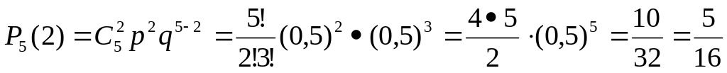 Решение. Вероятность того, что выпадет “герб” р = 0.5, не “герб” 0,5( q = 1 – 0,5 = 0.5). Монету бросают пять раз, значит, n = 5.