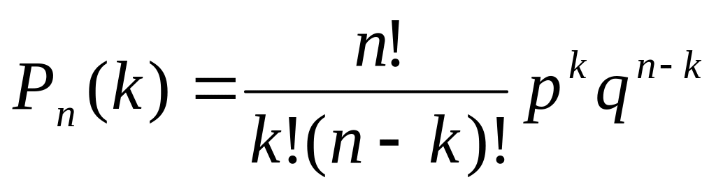 7.2 Формула Бернулли. Вероятность того, что в n независимых испытаниях, в каждом из которых вероятность появления события равна р (0<р<1), событие наступит ровно k раз (безразлично, в какой последовательности), равна