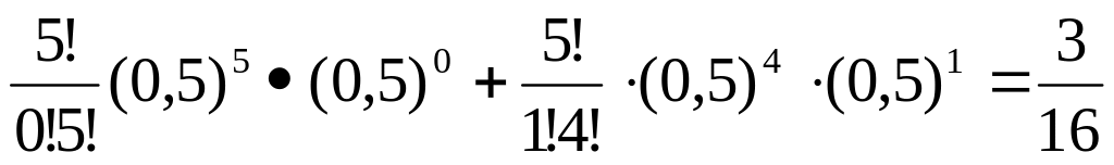 Р5 (k ≥ 2) = 1 - P5 (k <2) = 1 – 3/16 = 13/16.