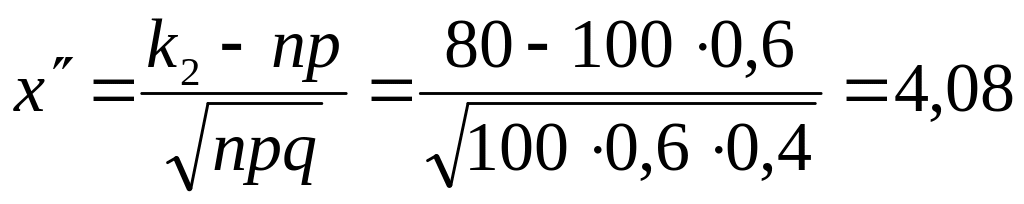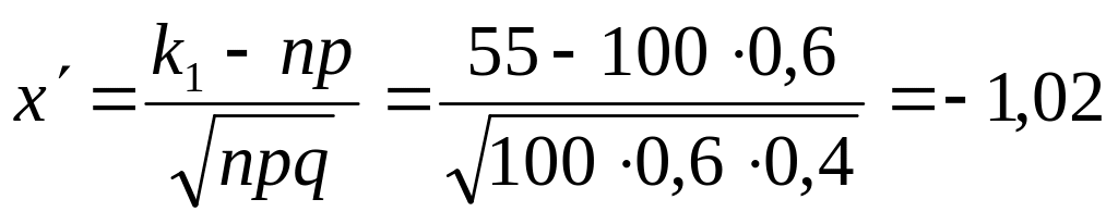 а) По условию, n = 100; р = 0,6; q = 0,4; k1 = 55; k2 = 80. Вычислим x' и х":