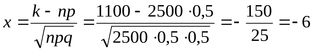 Задача 15. Найти вероятность того, что событие А наступит 1100 раз в 2500 испытаниях, если вероятность появления этого события в каждом испытании равна 0,5.