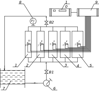 1 – 5 – экспериментальные сосуды; 6 – ручной гидравлический насос; 7 – бак;
