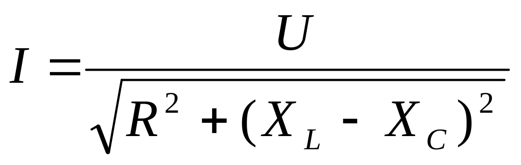 5. Величина тока в цепи переменного тока, содержащей активное сопротивление R, индуктивное сопротивление Xl и емкостное сопротивление Xc при последовательном соединении (рис. 15а) определяется по формуле