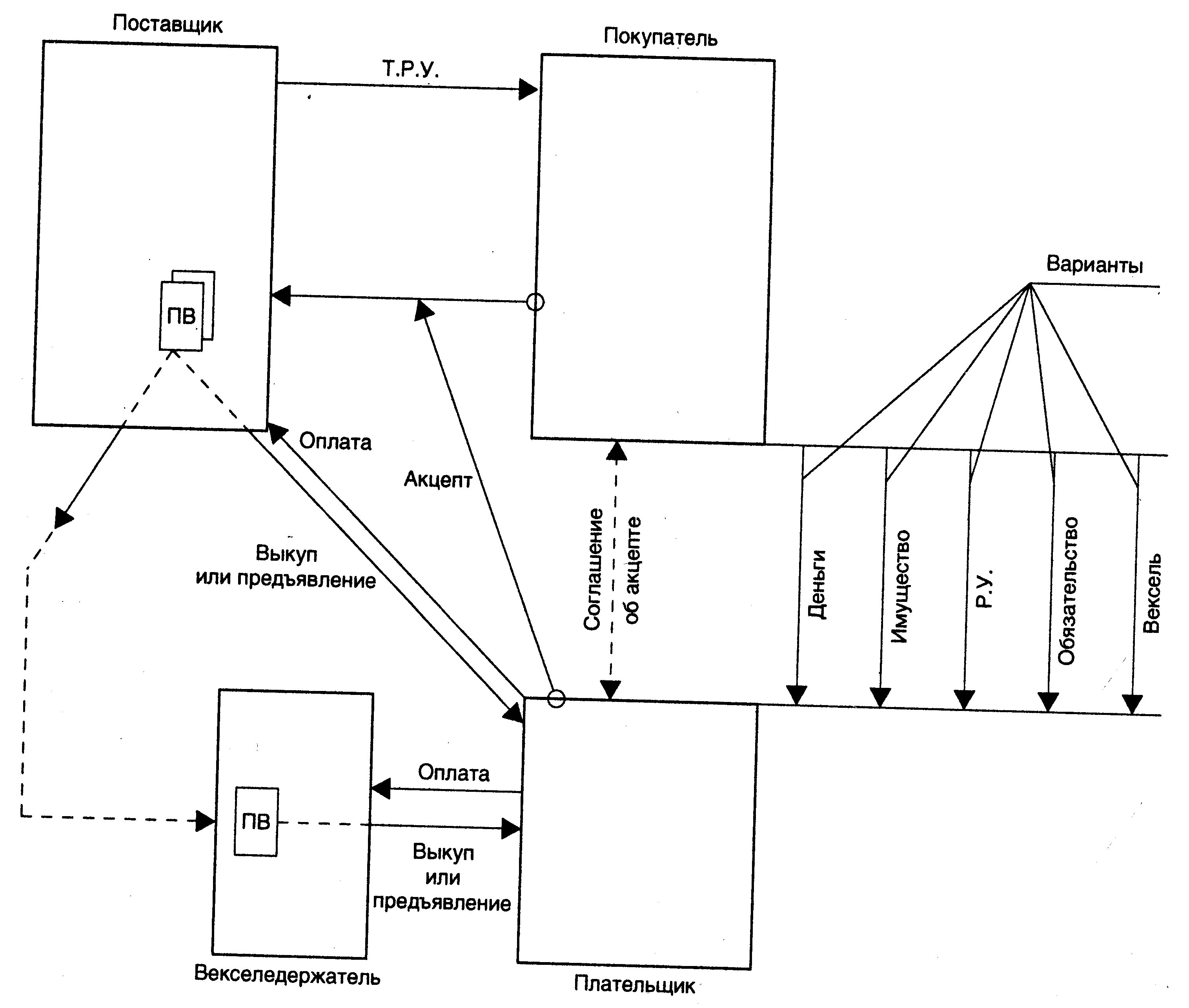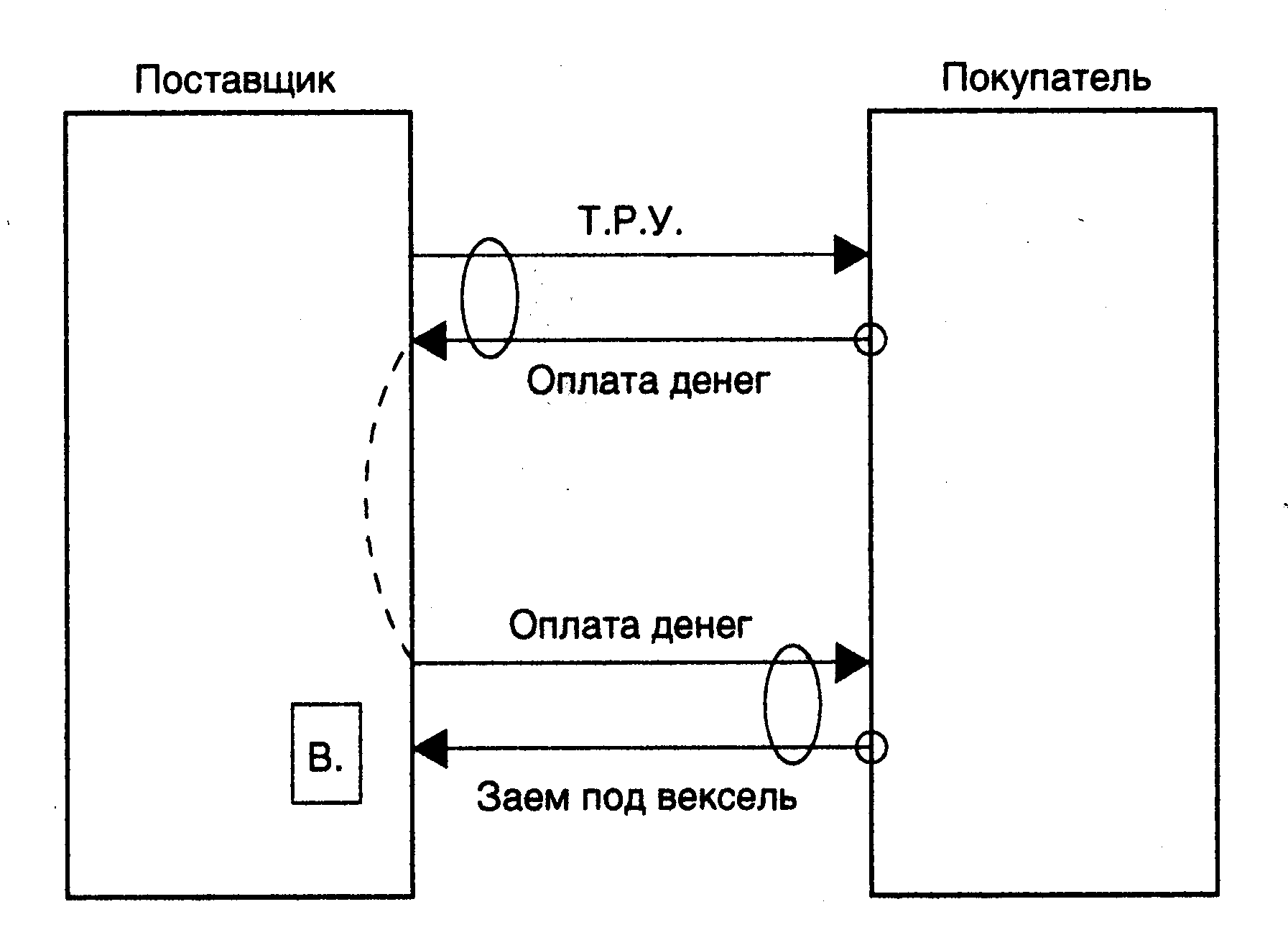Согласно идее этой «схемы» покупатель за имеющиеся у него деньги приобретает у коммерческого банка простой вексель, выдаваемый этим банком. Далее, вексель банка (как вексель третьего лица) передается от покупателя поставщику в оплату приобретаемых ТРУ. После чего поставщик возвращает покупателю вексель банка по сделке купли-продажи ценных бумаг, но на условиях «оплаты» со стороны покупателя путем выдачи им собственного векселя (векселя покупателя). Затем покупатель, выкупивший у поставщика вексель банка, должен вернуть вексель банка в банк, а себе возвратить от банка свои деньги. Делается это обычно либо путем предъявления векселя к оплате, либо путем досрочного выкупа банком своего собственного векселя.