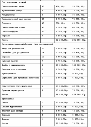 Первый вариант фитнес клуба – это аренда площади чуть более 400 м² платой 250р. за м² в месяц. Т.е. получается 100 000р. – аренда помещения в месяц.