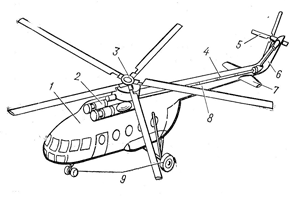 1 – фюзеляж; 2 – авиадвигатели; 3 – несущий винт; 4 – трансмиссия;5 – хвостовой винт; 6 – концевая балка; 7 – стабилизатор; 8 – хвостовая балка; 9 – шасси