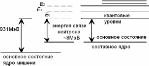 Нейтрон, попадая в поле ядерных сил, разгоняется и при непосредственном столкновении отдает не возбуждению E = 8 МэВ. Поэтому, зная энергию E0, можем найти уровень основного состояния составного ядра, а затем уже можем начертить расположение квантовых уровней составного ядра.