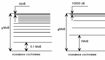 Так же, как и в атоме, полная внутренняя энергия ядра Eвн имеет определенные дискретные уровни. Под Eвн понимается сумма кинетической энергии и потенциальной энергии взаимодействия нуклонов. Уровни энергии ядра лежат достаточно далеко друг от друга вблизи основного состояния и все теснее сближаются с ростом энергии. Схема расположения уровней энергии для ядер различной массы показана на рис. 2.2.1.