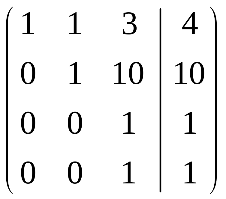 Розв’язання. Складемо розширену матрицю системи і будемо робити над нею необхідні елементарні перетворення, щоб одержати трикутну матрицю. На початку переставимо перше і третє рівняння місцями, а потім помножимо елементи першого рядка відповідно на мінус три, мінус два та мінус два і одержані результати додамо відповідно до елементів другого, третього та четвертого рядків. Аналогічно вчинимо з елементами другого, а потім третього рядків. Одержимо матрицю