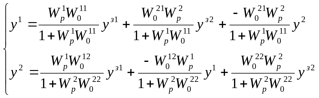 Из уравнения (2.3) видно, что каждая регулируемая величина зависит и от первого входа системы , и от второго входа системы . Покажем, что устойчивость несвязанной системы в этом случае уменьшается. Для этого примем, что передаточные функции объекта по основным и перекрестным каналам равны между собой и равны между собой передаточные функции регуляторов.