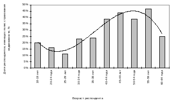 Провал спроса на страхование между 20 и 30 годами связан, по всей видимости, с переходом потенциальных клиентов к самостоятельной жизни и с образованием семьи. До 20 лет полисы приобретаются родителями или за счет родителей, при отделении от них спрос падает в связи с нехваткой средств и отсутствием предметов страхования. Впоследствии, после того, как основные семейные покупки сделаны, а уровень доходов растет, спрос на страхование также увеличивается. Вполне возможно, что рост склонности к страхованию с возрастом частично объясняется сохранением привычек с “Госстраховских” советских времен. С другой стороны, значительная часть руководящего состава российских предприятий, имеющего высокий уровень доходов, относится к категории лиц старшего возраста или, по крайней мере, старше 30 лет. К этой же возрастной категории относится значительное большинство квалифицированных высокооплачиваемых специалистов коммерческих фирм, составляющих ядро “среднего класса”. Поэтому на них приходится наибольший интерес к страхованию.