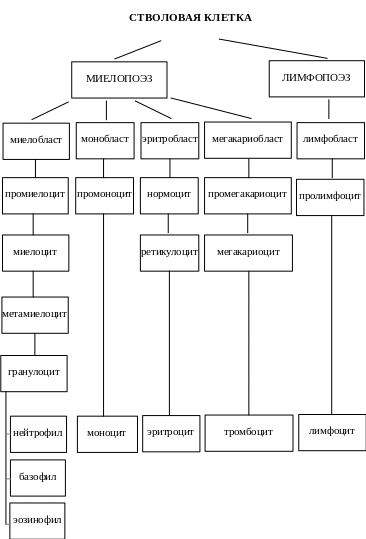 Существуют 2 ростка кроветворения: лимфопоэз и миелопоэз. Все клетки, проходящие дифференцировку в любом ростке кроветворения, существуют в двух формах – бластной (более молодой и незрелой) и лимфоцитоподобной (более зрелой). В процессе дифференцировки из бластных форм формируются зрелые клетки крови, которые затем поступают в периферическое русло.