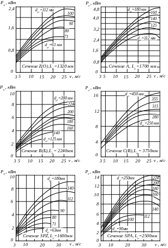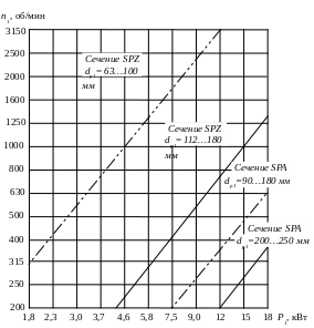 Ремни типа Z(О) применяют для передаваемой мощности Р1 до 2 кВт. Остальные типы сечения ремней выбирают по графикам. График для выбора
