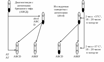 В данной реакции наряду со специфическим антигеном используют родственные гетерологические АГ. Например, у больного брюшным тифом (Т) сыворотка крови дала агглютинацию со специфическим диагностикумом Т и с групповым паратифа А.