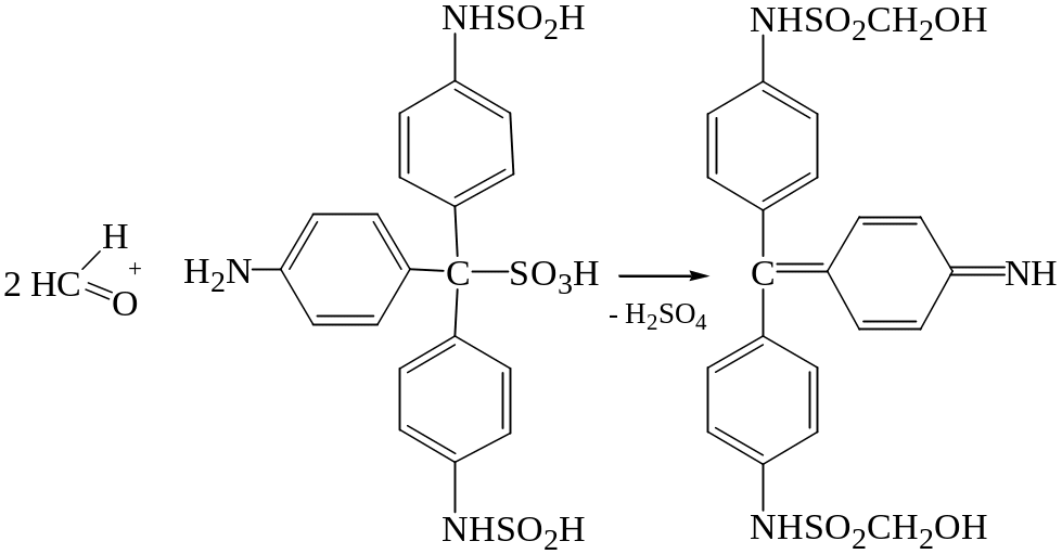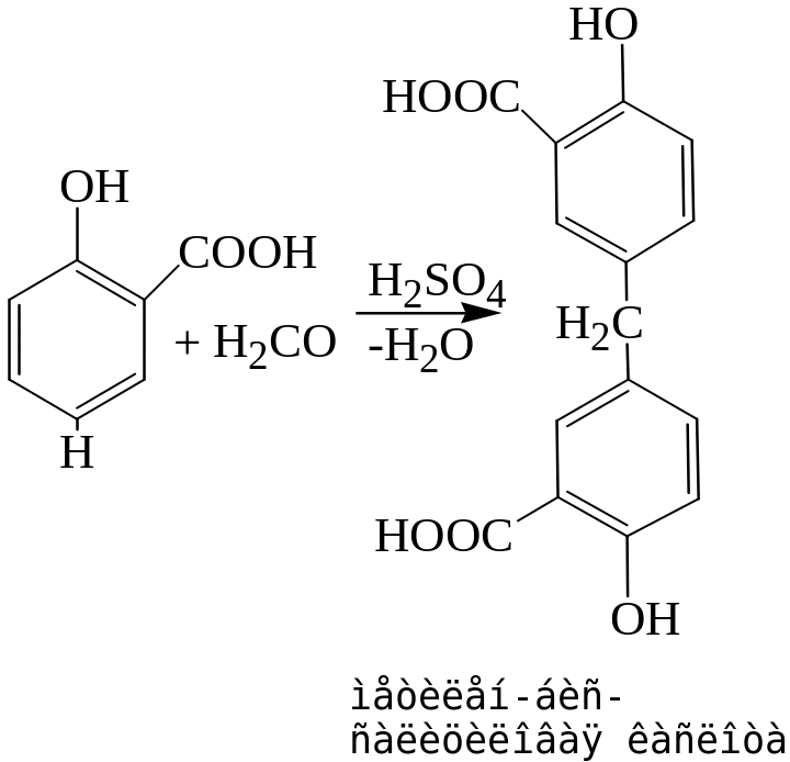 В присутствии концентрированной серной кислоты происходит конденсация салициловой кислоты с формальдегидом с образованием метилен-бис-салициловой кислоты, которая окисляется до хиноидной структуры и вступает во взаимодействие с непрореагировавшей салициловой кислотой с образованием ауринового красителя красного цвета.