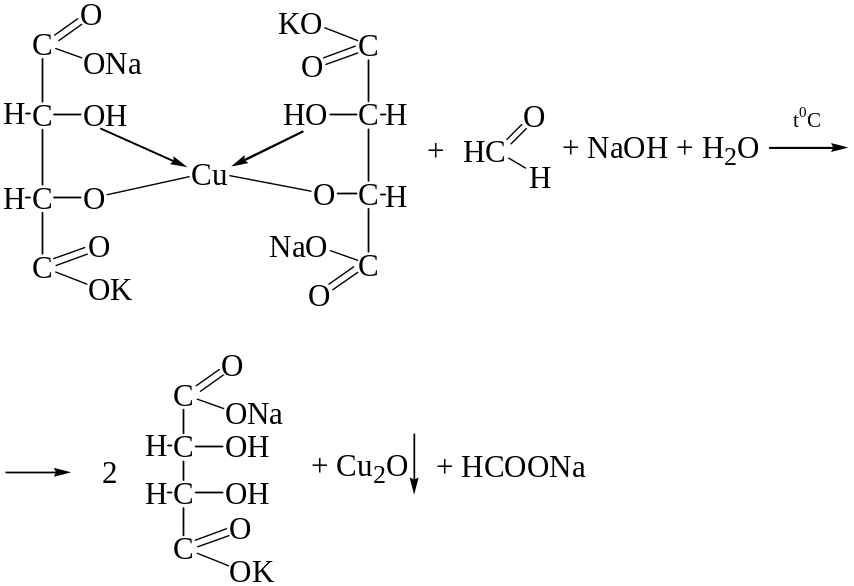 При нагревании реактива Фелинга с формальдегидом выпадает красный осадок оксида меди (I) Cu2O.