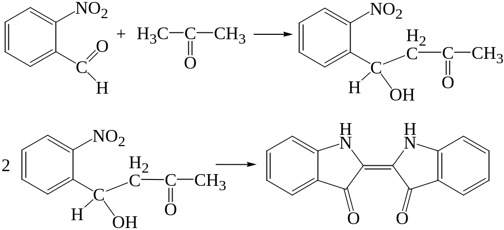 При нагревании уксусной кислоты или ацетатов с солями кальция образуется ацетон, способный в присутствии щелочей взаимодействовать с о-нитробензальдегидом. Конечным продуктом реакции является индиго.