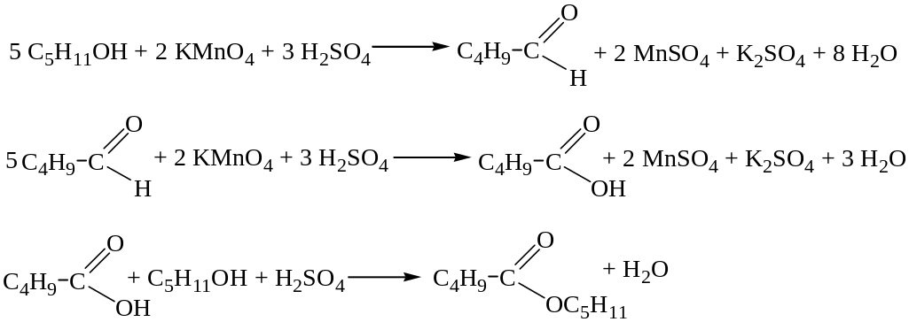 Этиловый спирт окисляется до ацетальдегида, а изоамиловый спирт - до изовалерианового альдегида, которые обладают характерным запахом и определяются по его наличию.