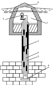 10.3 Глубинные репера и деформационные знаки. Для плановых опорных знаков применяют трубчатые конструкции. Стальную трубу диаметром 100 – 300 мм заглубляют в грунт не менее чем на метр ниже верхней границы коренных пород; к верхней части трубы крепится знак. Вокруг основной трубы крепится защитная, пространство между ними заливается битумом снизу и заполняется теплоизоляционным материалом в верхней части. Опорные высотные реперы также выполняются в виде трубчатых конструкций (рис. 35), но для учёта изменения длины из-за изменения температуры используют две трубы из разного материала (стальная 2 и дюралюминиевая 1); такой репер называют биметаллическим. Две трубы заключаются в защитную трубу 3, крепятся к общему башмаку 4 и бетонируются в твёрдых породах. На дюрале оборудуется базовая поверхность, на стали – кронштейн для отсчётного приспособления 5. Защитная труба бетонируется в смотровом колодце 7 с крышкой 6.