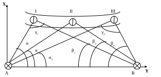 В методе триангуляции опорные знаки I, II, III закладываются в устойчивом грунте на значительных расстояниях от объёкта. На сооружении закрепляются наблюдательные столбы A и B, координаты которых определяют по циклам (периодически). Для этого с высокой точностью определяют длину базиса AB и измеряют все углы во всех треугольниках (рис. 38). В результате обработки триангуляции получают координаты наблюдаемых пунктов. Смещения вычисляют как разности соответствующих координат между циклами.