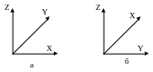 Рис. 41. Правая (а) и левая (б) системы координат.