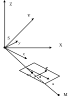 где ai, bi, ci – косинусы углов, образованных соответствующими координатными осями. Обозначив через S центр проекции, M – точку местности, m – её проекцию, найдём, что