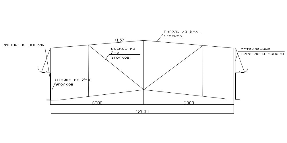 Для дополнительного верхнего освещения здания и для естественной вентиляции цехов на покрытии двух пролетов предусмотрены светоаэрационные фонари прямоугольного сечения (рис.11). Фонарь располагается вдоль здания и не доходит до торцов здания на один шаг несущих конструкций покрытия. Шаг фонарных ферм равен шагу несущих элементов покрытия-6м фонарь имеет несущий остов, состоящий из стальных рам, которые при помощи сварки и болтов крепят к несущим конструкциям покрытия. Фонарные панели устанавливаются на несущие конструкции покрытия вдоль фонаря и несут на себе нагрузку от остекления фонаря. Открывание оконных переплетов осуществляется под углом 70°. Покрытие фонаря повторяет конструкцию покрытия здания. Уклон фонаря равен 1,5%.